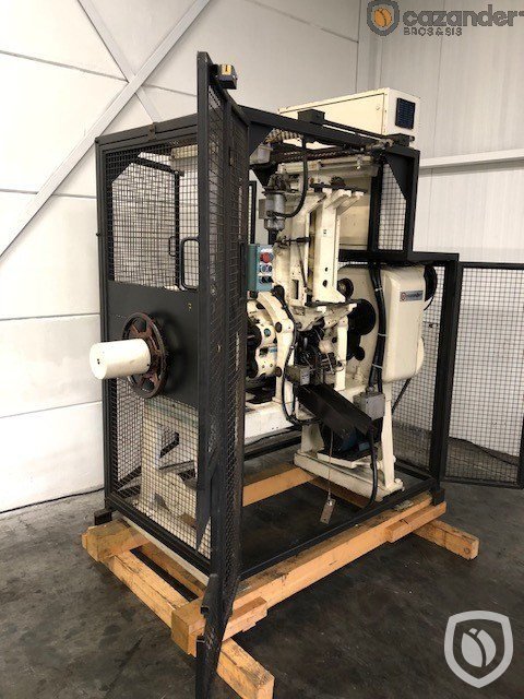 Adecuada para la producción de latas de alimentos, de bebidas o de aerosol, esta pestañadora usada es una máquina totalmente automática de seis cabezales para la pestañado de rulinas simultáneamente de ambos extremos de latas del diámetro 65 mm, recibida de una formadora de cuerpo, encuelladora o separador.