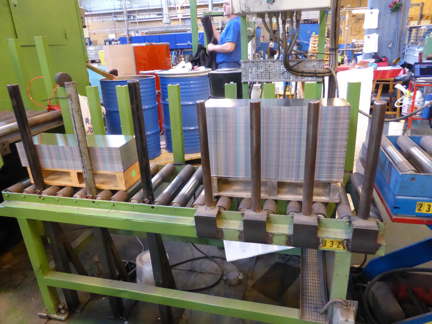 Cizalla COMBI con alimentador automático de hojas MAWAG F2; la primera operación es la guillotina y la segunda es el corte con rodillo para la producción de latas de Ø 235 mm de diámetro. La cizalla de rodillos tiene cuchillas de carburo con dispositivo de sujeción hidráulica, el eje es de Ø 92 mm.