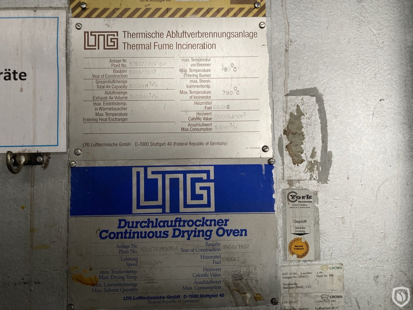 Barnizadora de pinzas Mailander usada de calidad con alimentador. El horno de secado a gas LTG tiene una longitud total de calentamiento de 30 metros con 4 zonas y 1 post-quemador. La línea estuvo funcionando hasta el primer trimestre de 2021.